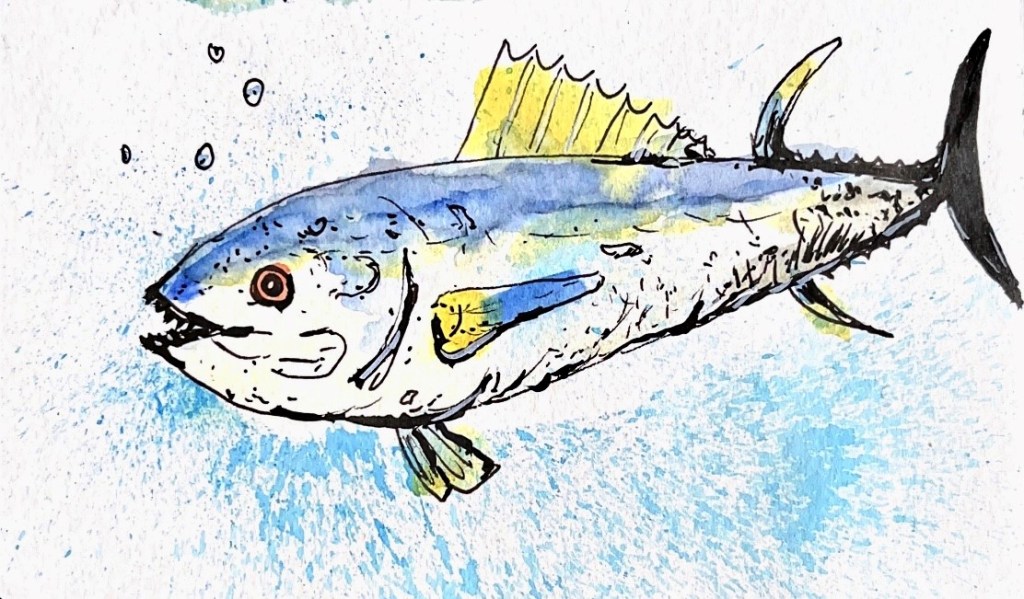 Notes: This post is not about judging if you eat fish (I do, occasionally*), but it is always good to think about where your food comes from, no matter your dietary decisions. I think my first introduction to ocean fish, including Tuna, was via a tuna-fish sandwich when I was young (in case you were wondering, I grew up near freshwater lakes, but not the ocean!). Since then I have been to school, and learned more. I find Tuna to be most impressive and I hope I get the opportunity to see them (live) sometime in my life – I do not really know how this might work since I don’t spend a lot of time in the ocean. The species depicted above is my interpretation of a Yellowfin Tuna** – a species that is pelagic, gets very large (400 lbs or more!), eats other fish, crustaceans, and other things, and it schools (i.e., swims together in large groups). I like to imagine Yellowfin Tuna swimming together in the beautiful ocean.