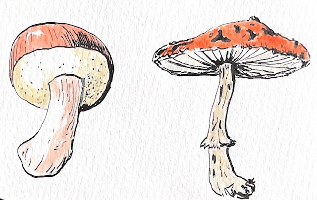 Notes: I went for a walk in the woods last weekend, and it was mushroom season! So many mushrooms were popping up from the forest floor – they are magical – as if from another world. When I was an undergraduate student, I had a choice between taking a Mycology class by George Barron* (at the University of Guelph), or an Entomology class. I selected the latter and that choice was one small decision that had a significant impact on my life, since my love of entomology (well, arachnology) was certainly fueled in part by that course. George Barron, however, was unbelievably enthusiastic about mushrooms, and he spend a good half hour or more with me (a naïve undergraduate student at the time), discussing the world of mycology and why it is such an important world to know better. That conversation has always stuck with me, even after almost three decades – he was so generous with his time, and so inspiring. So, I like mushrooms** even though my knowledge is limited. They really are incredible, wouldn’t you say? The colours, shapes, and unpredictability of their lives. And they serve such an important ecological function. It was very pleasant to draw the mushrooms you see above, but in truth, they are not depicting a specific type of mushroom – they are just mushrooms. I also ran into the same problem as last week – I did two different panels of mushrooms in my sketchbook, and couldn’t decide which to post, so I have posted them both for you. I hope you enjoy!