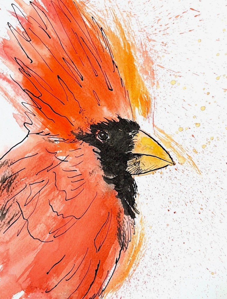 * my sloppy/messy watercolour is low on accuracy, but if I close my eyes, I imagine cardinals more like my depiction, above. Lots of wild colour kind of all over the place.