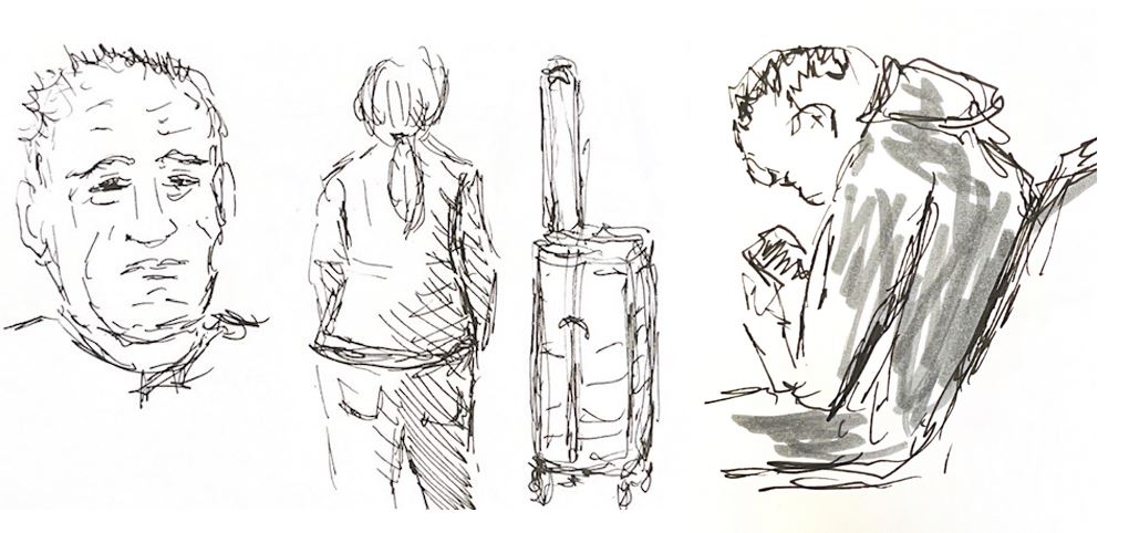 Notes: Airports are strange places*. I was travelling earlier this month so I got to experience quite a few of them. And, of course, airports always seem to involve either rushing around in a panic, or boredom – there is not much in between. For someone who likes certainty (don’t we all?), I find that airports can sometimes be anxiety-provoking. I generally try to practice my figure and portrait sketches** when waiting in an airport lounge, and the images I am sharing today were done earlier in November at airports in Orlando, Newark, and Raleigh, and I also had time for writing more than a few Haiku***. I seem to be unable to focus on much when in transit, so getting out the pen and sketchbook is somewhat therapeutic and helps pass the time. People watching is, I think, a fun part of the airport experience, and I certainly observed the ongoing attachment to fast food, cellphones and music-listening. While a few people had books (or e-books), most were scrolling through their screens, texting, or otherwise fixated on the small screen they were clutching, or enjoying French Fries. Or, they were sitting with their eyes closed, listening to music (or, of course, there were some families present too, and their level of activity was markedly different, and was more about parents trying to ‘shush’ their kids, or chase after them. It was hard to do figure sketches with all that activity!). Overall people were in their own bubbles, so despite airports being such busy places, they can be surprisingly quiet.