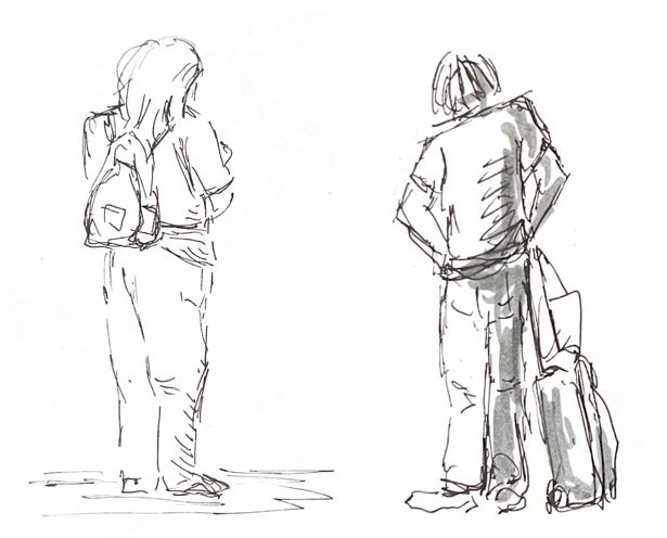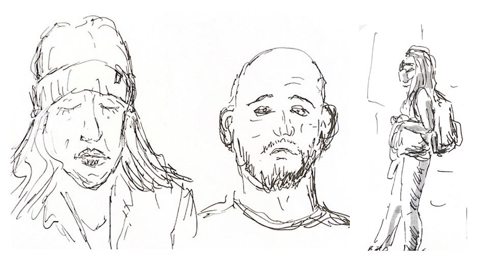 **full disclosure: I really struggle with drawing people or any parts of them. For some reason I can’t seem to find the enthusiasm to practice the human figure or face, but like all things, practice is the key. I try to keep the tools very simple when doing quick figure sketches i.e., technical pen and sometimes a grey brush pen for a bit of shading, and a small (3 x 5”) pocket sketchbook. I also try to be really discrete and quick about the sketches. I try to sit relatively far from subjects, and each sketch is typically done in just 2-3 minutes. More time does not tend to help, I find!