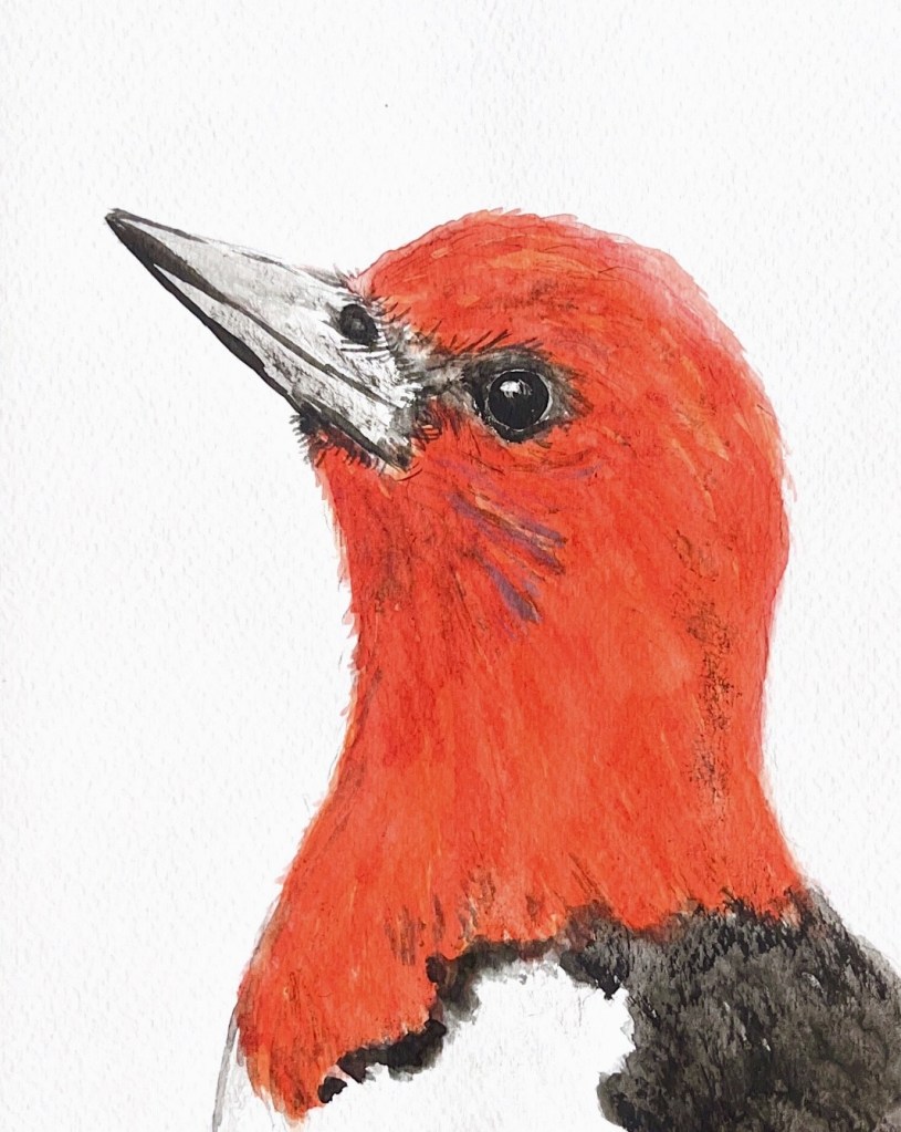 Red-headed woodpeckers are wonderful birds, but I only know this through photos and stories since I have never seen one*. While their range does get into parts of Ontario and Quebec, they are rare in my corner of the world. These woodpeckers certainly eat insects and drill into dead wood like their cousins, but they also eat fruits, nuts and acorns, and seeds, so they are quite an omnivorous woodpecker.