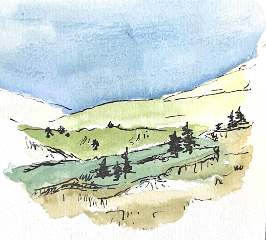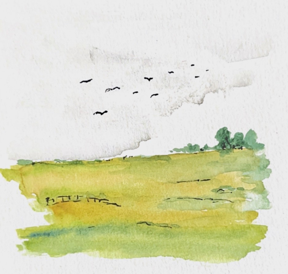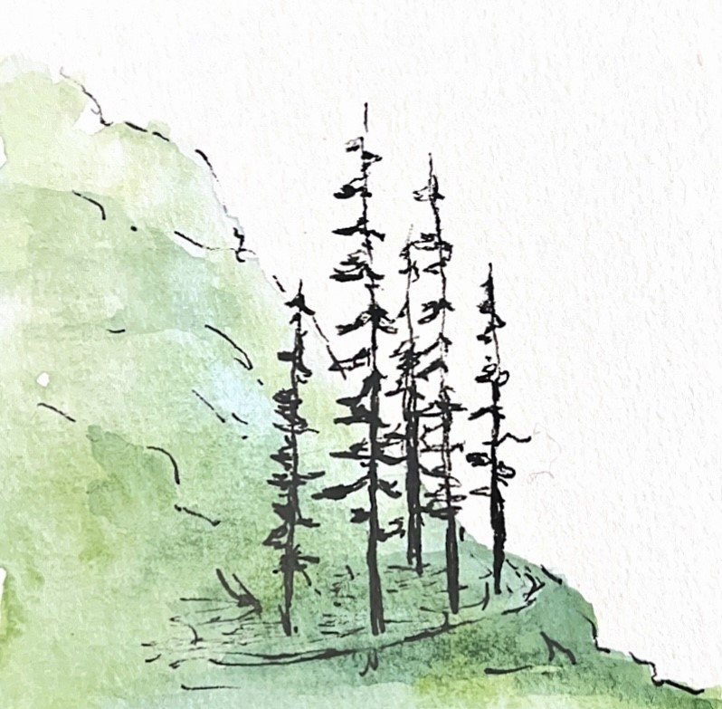 But as spring emerges and the daylength gets longer, the views out the train window are lovely, especially as I transition from city centre, to the suburbs, and finally to the fields and forests as I get closer to my hometown. I tried to capture some of these in watercolour (with a bit of pen), but also used my imagination for some, and used the views out of the window as inspiration for unseen landscapes or landscapes in my mind. I hope you enjoy!