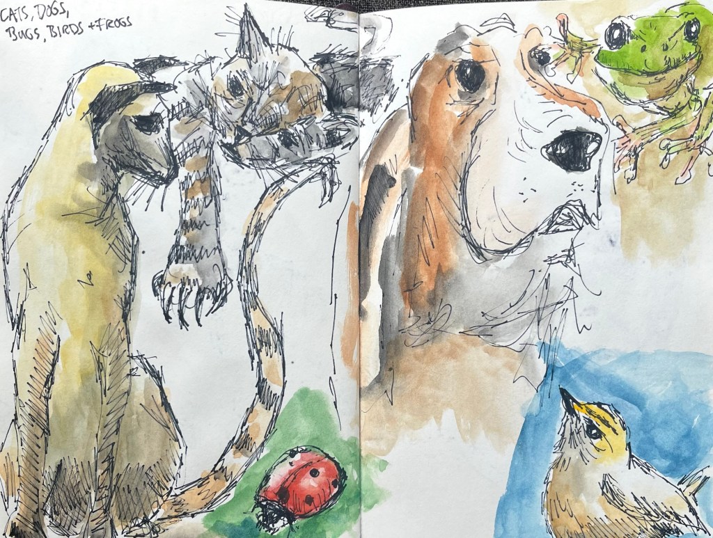 This is the big question, and turning to Cats, Dogs, Bugs, Birds, and Frogs for clues is key, at least for me. Just do stuff. Just make it messy, have fun, and don’t overthink. One pencil line, one sentence, or one wash of watercolour is the step to take. You need not think of the next dozen steps. It starts with one.