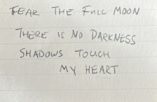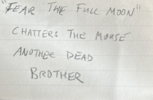 PS Interestingly, common phrases and themes do emerge when lots of short poems are written. “Fear the full moon” shows up twice, above, yet these pocket poems were written weeks apart. Huh.
