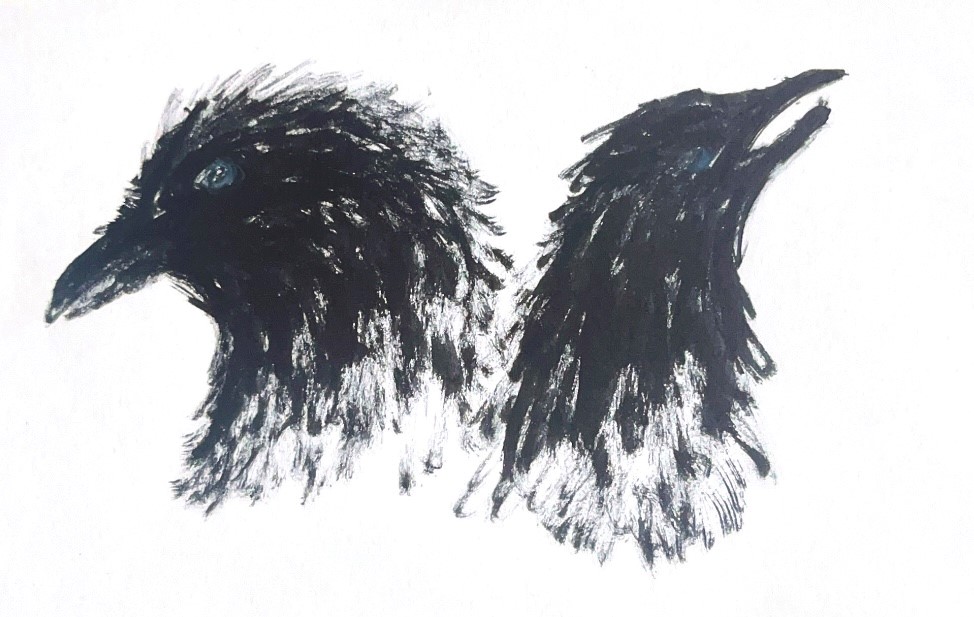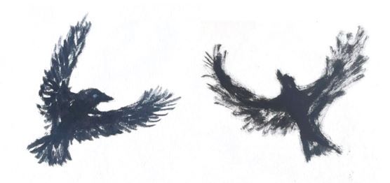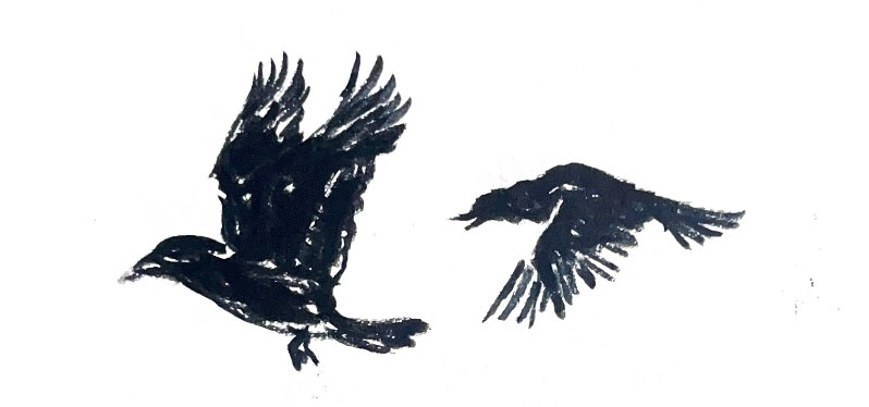 Notes: I am in awe of crows* and enjoy drawing them**. There are great books written about crows (and their relatives!), that highlight their intelligence, behaviours, and inquisitive nature (some good videos out there too). I like to watch crows, especially murders*** of them, bobbing their heads, hopping about, talking to each other. I am grateful that I see and hear crows almost daily.